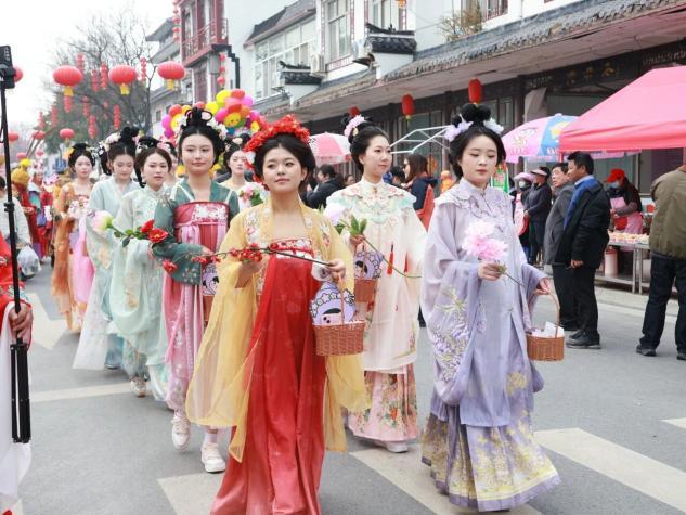 十二花神手持花卉,沿蒋坝老街缓缓巡游,一路与游客温情互动。途经老街核心打卡点,花神驻足行礼,展示汉服礼仪。老街特设“湖河遇美・食药绘淮”展示台,现场发放祈福牌、文创贴纸,邀请游客合影打卡,收集美好感言,让国风文化走进大众。